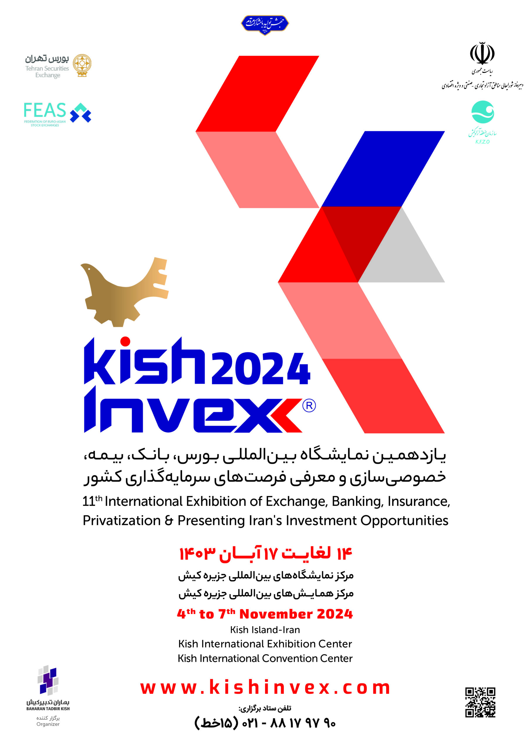 نمایشگاه بین المللی بورس، بانک، بیمه، خصوصی سازی و معرفی فرصت های سرمایه گذاری کشور ( کیش اینوکس 2024) و اجلاس پاییزه فدراسیون بورس های اروپا-آسیایی (فیاس) از 14 لغایت 17 آبان ماه 1403 در جزیره کیش برگزار میشود.