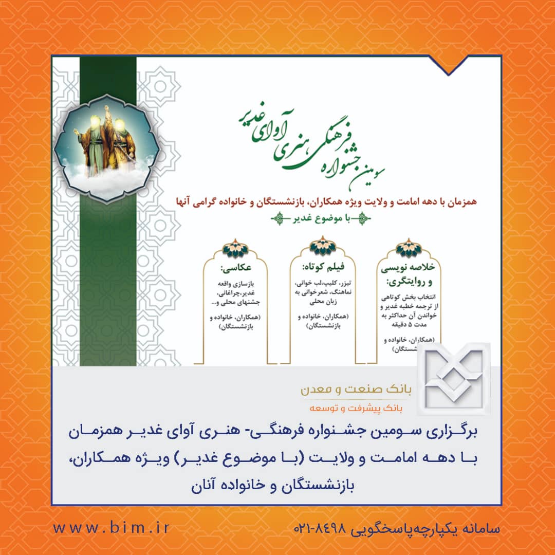 این جشنواره که در دو سال گذشته در رشته های مختلف و متنوع هنری برگزار شده است؛ امسال نیز در رشته های نقاشی (با موضوع نماز، قربان و غدیر)، کاردستی (در رشته های روزنامه دیواری، کلاژ، سفال گری و …)، خلاصه نویسی و روایتگری (انتخاب بخش کوتاهی از ترجمه خطبه غدیر و خواندن آن)، فیلم کوتاه (شامل تیزر، کلیپ، لب خوانی، نماهنگ و شعرخوانی به زبان محلی)، عکاسی (با موضوع بازسازی واقعه غدیر، جشن های محلی، چراغانی) و مسابقه کتابخوانی( کتاب قصه قرآنی) غدیر برگزار می شود.