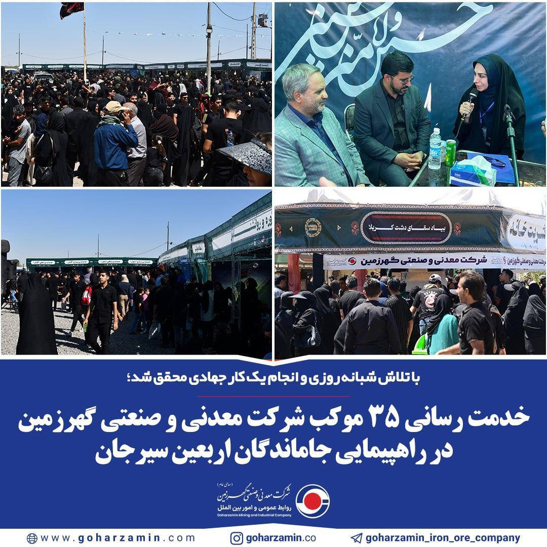 در این راستا، شرکت معدنی و صنعتی گهرزمین، اربعین امسال نیز با برنامهریزی بهتر نسبت به سنوات گذشته، با برپایی ۳۵ موکب مختلف و خدمترسان شامل (رادیو اربعین، گمشدگان، کودک و نوجوان، سرگرمی، آرایشگاه مردانه، روانشناسی، پذیرایی، واکس، هلال احمر، روایتگری، خدمات پزشکی و پرستاری، ناشنوایان، ستاد اقامه نماز، شربتخانه و …) در محل امامزاده علی (ع) سیرجان به شرکتکنندگان در این مراسم معنوی خدمت ارائه کرد و از جمعیت دهها هزار نفری پذیرایی نمود.
