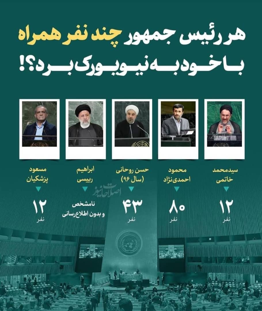 دولت حسن روحانی در سال 1396 نیز 43 نفر را با خود به نیویورک برد و این درحالی است که هیات همراه محمود احمدینژاد 80 نفر بودند.