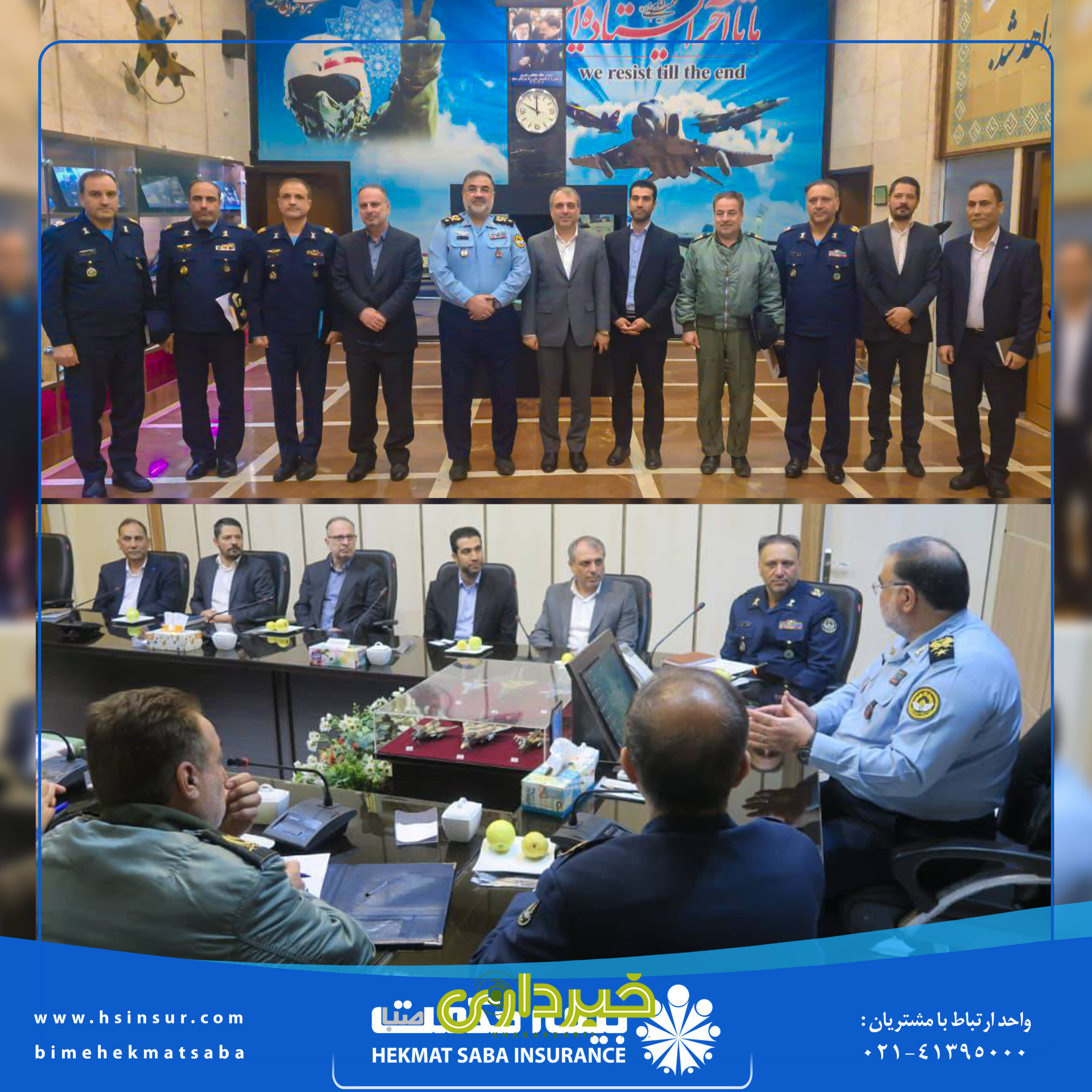 خبرداری؟ دکتر بهاریفر مدیرعامل و نایب رئیس هیات مدیره شرکت بیمه حکمت صبا با امیر سرتیپ خلبان حمید واحدی فرمانده نیروی هوایی ارتش جمهوری اسلامی ایران دیدار کرد.