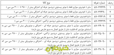 فهرست کد تعرفه‌های مشمول این ممنوعیت به شرح زیر است: