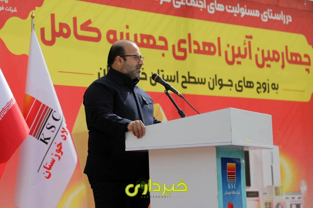 امین ابراهیمی اظهار داشت: شرکت فولاد خوزستان در راستای توجه به کانون خانواده حدود چهار سال است که این آیین را برگزار می‌نماید. این طرح با اهدای ۷۵ سرویس جهیزیه به جوانان استان آغاز گشته و اکنون به ۱۵۰ سرویس جهیزیه رسیده است.