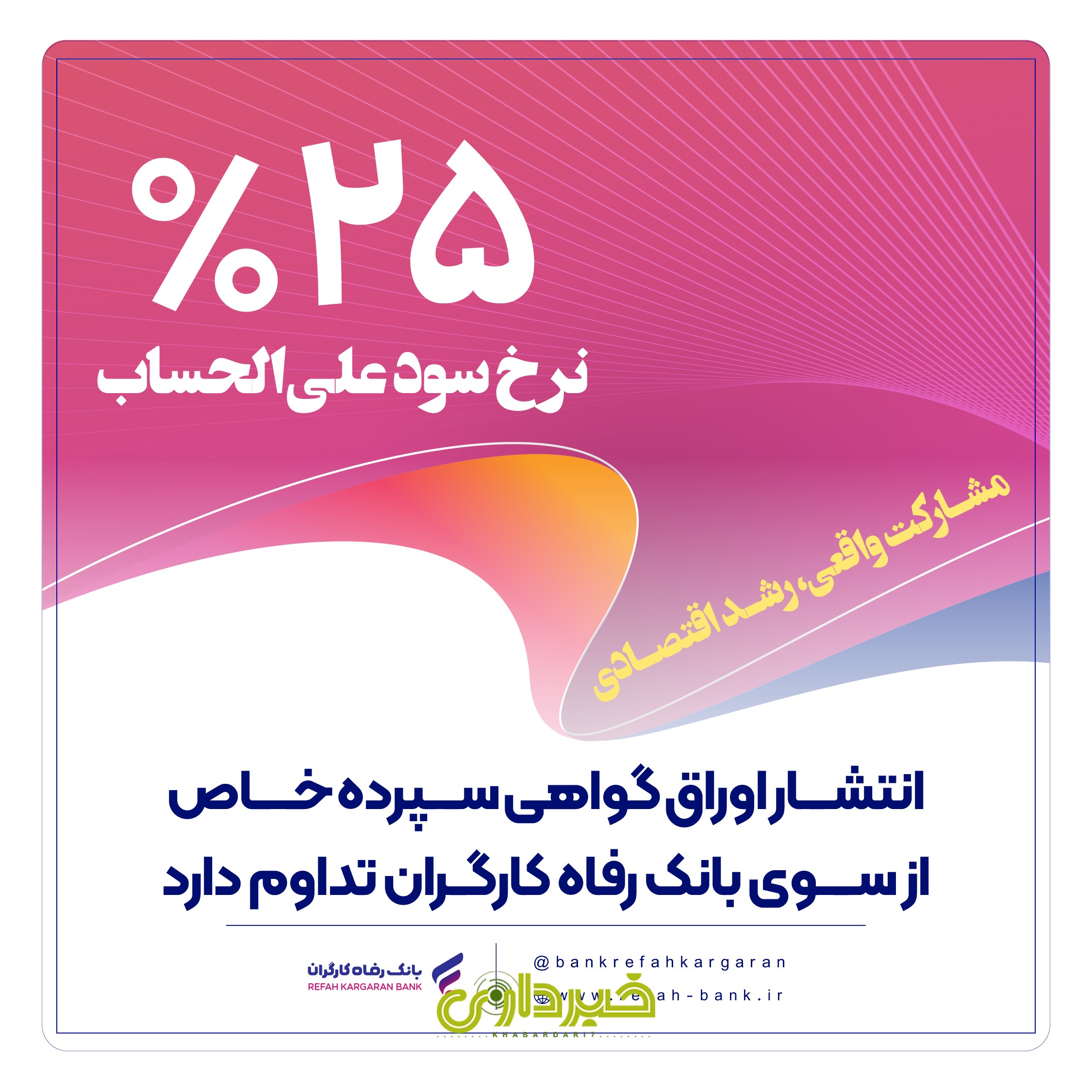 به نقل از پول نیوز، بهدنبال استقبال مشتریان بانک رفاه کارگران، انتشار اوراق گواهی سپرده مدتدار ویژه سرمایهگذاری (خاص) از سوی این بانک برای شرکتهای آرانماشین توس، فارمد پلاست پویان، مدیتکسیس، فارمد و صنایع بستهبندی فرآوردههای شیری پگاه تداوم دارد.