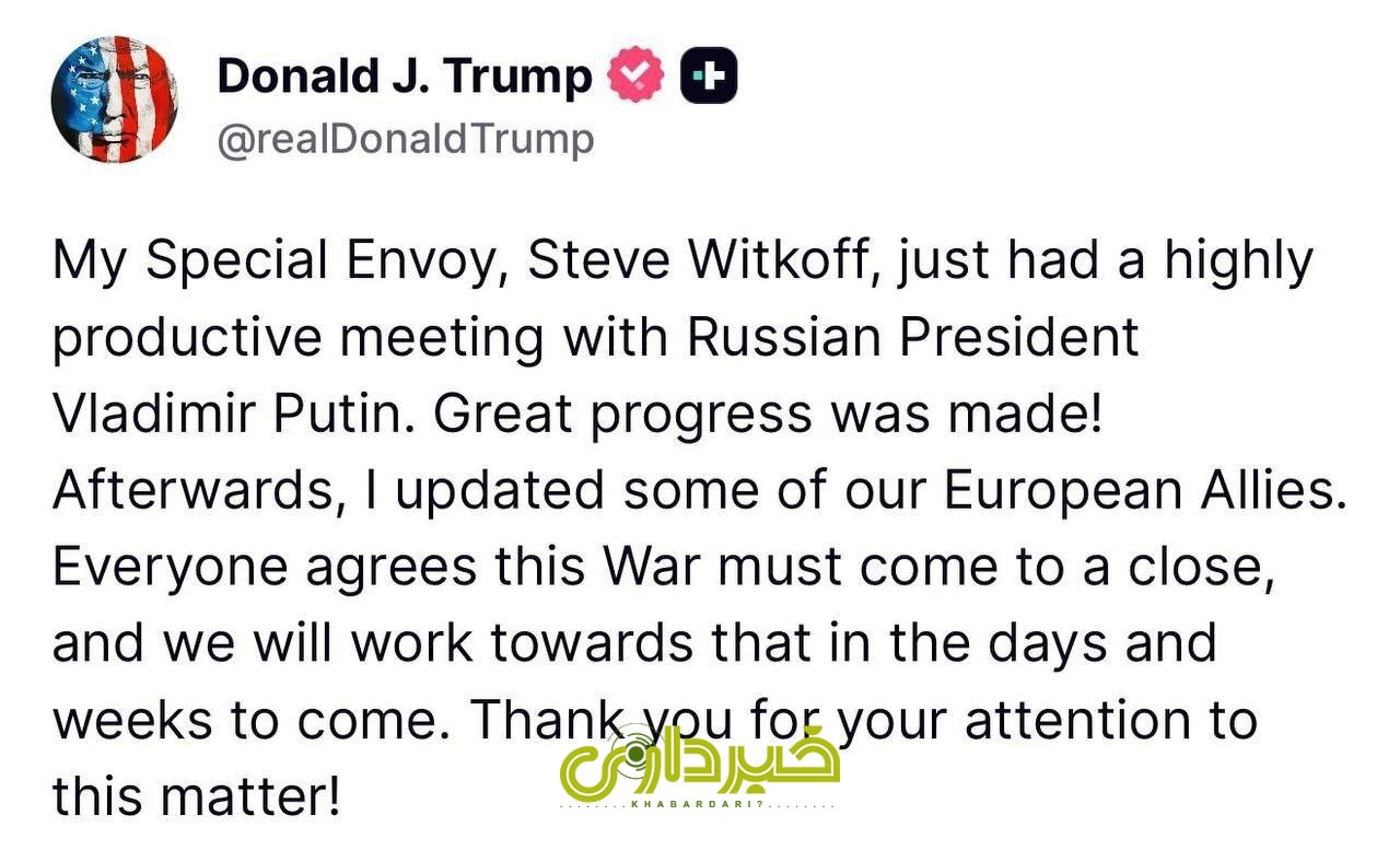 خبرداری؟  دونالد ترامپ، رئیس‌جمهور سابق آمریکا، اعلام کرد نماینده ویژه‌اش، استیو ویتکاف، دیداری بسیار سازنده با ولادیمیر پوتین، رئیس‌جمهور روسیه، داشته است. ترامپ در پیامی نوشت: «پیشرفت چشمگیری حاصل شد.»