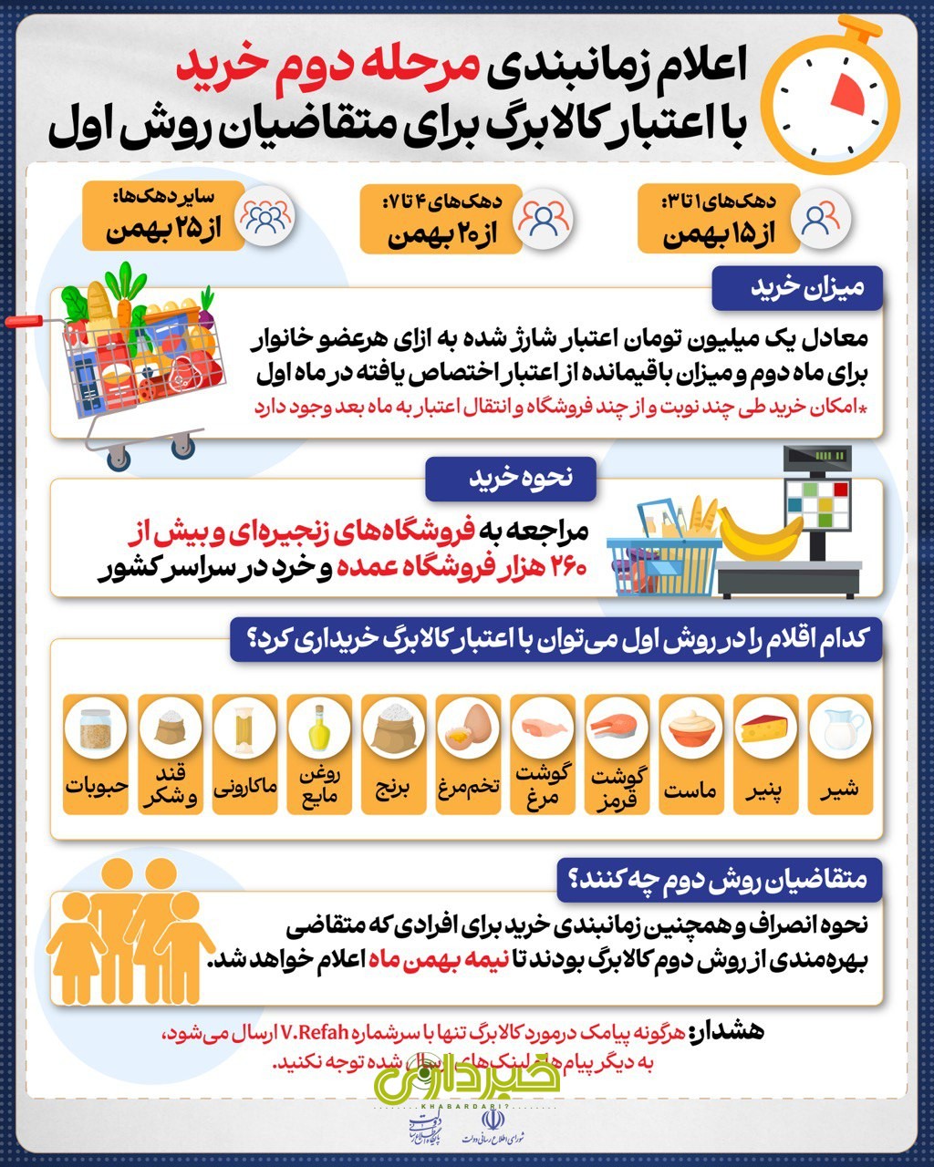 خبرداری؟ «دهکهای ۴ تا ۷ از ۲۰ بهمن و سایر خانوارها از ۲۵ بهمن میتوانند به فروشگاهها مراجعه کنند. در صورتی که اعتبار هر ماه بهطور کامل استفاده نشود، مانده، به ماههای بعد منتقل خواهد شد و هموطنان از این بابت نگران نباشند.